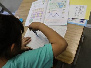 3年生は面積の勉強、4年生はコンパスを使って円を描いていました。