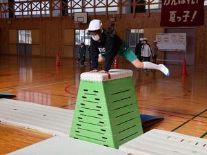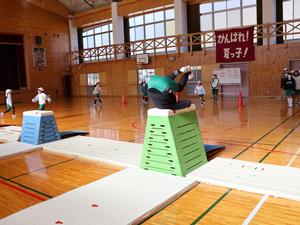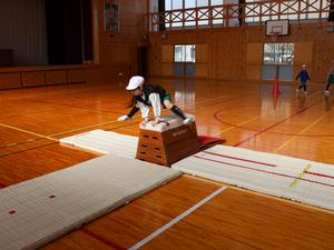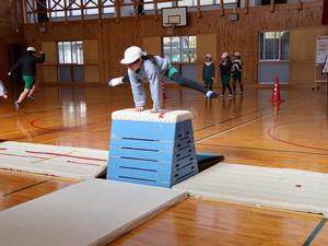 まずは、1・2年生の体育。上学年の子たちと同じように跳び箱に挑戦中です。