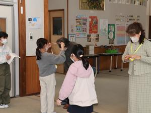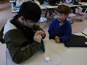 ここまでの授業でだいたいおもちゃが完成したので、6時間目に1・2年生を呼んで遊んでもらいました。