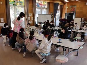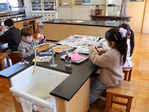 まずは、1・2年生。図画工作の授業で折り紙を使って飾りを作っていました。