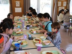 毎日みんな一緒に給食を食べます。
