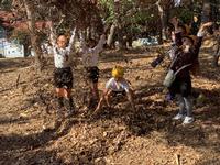 落ち葉やどんぐり、枝やつるなど、秋の素材を組み合わせて作品を作ったり、遊んだりしました。子供たちは落ち葉を集めてシャワーのように飛ばしたり、紐でつないでネックレスを作ったりと、自分のやりたい活動に没頭していました。