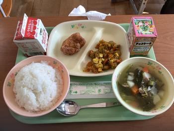 今日は、2学期最後の給食でした。メニューは、ごはん、野菜スープ、ドライカレー、フライドチキン、ミニケーキ、牛乳でした。子供たちが好きなメニューが多く、とても楽しんで食べることができました。3学期は、どんなメニューが出るのか楽しみです。