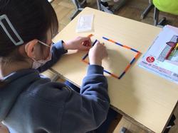 算数の授業で、同じ長さのストローを18本並べて長方形をつくり、縦の本数を増やしたとき横の本数がどのように変わるかを調べてみました。表にかいたとき、縦と横の本数の変わり方にどのようなきまりがあるかを見つけるのは難しかったですね。これから一緒に練習していきましょう。