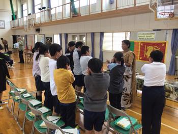 学校フレンドシップ事業として、6年生はアジア6か国の文化に関する学習をしました。講師の先生をお招きし、各国の文化を肌で感じる体験をしました。スリランカのブースでは、民族楽器を弾いたり、民族衣装を着たりして、その国の生活文化に親しみました。また、各国の言語で挨拶する子どもたちの姿はたいへん生き生きとしていました。子どもたちは、アジア6か国の文化に関する知識を身に付けることができました。