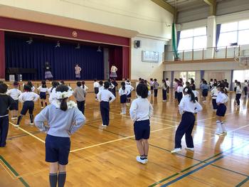 岡崎文化協会体験学習の一つとして、2年生がフラダンス教室を開きました。多くの児童は初めてフラダンスに触れ、とても楽しそうに踊っていました。さらに、首や頭につける飾りも貸していただき、子供たちの気分は最高潮でした。