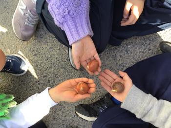 「たまねぎみたい!」と不思議そうに球根を観察し、皮をめくり、丁寧に土をかぶせました。