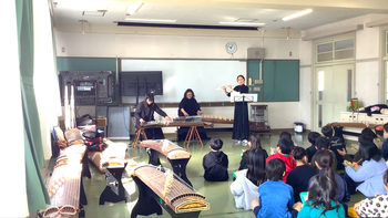 2時間目に、琴とフルートによる演奏会と琴体験会がありました。琴ならではの楽曲から最近の流行ポップスまで、幅広い演奏を味わいました。その後、琴に触ったり奏法を教えてもらったりと、貴重な体験をしました。
