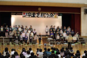 本日、全校で卒業を祝う会を行いました。5年生が会の企画・運営を行い、スライドを見ながら卒業生の1年生から6年生までの思い出を振り返りました。1年生がメダルをかけ、各学年からのお祝いの言葉、クイズ、歌などがあり、全校で心を込めて卒業をお祝いすることができました。