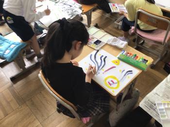 本日3年生は、図画工作科で「絵の具と水のハーモニー」を学習しました。水の量を調整して、色や見た目が異なる線を組み合わせて、思い思いに表現する姿が見られました。完成した友達の作品がどのように出来上がったかを鑑賞するのが楽しみです。