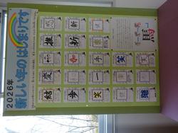児童玄関前には、教職員の「今年の目標漢字一文字」、体育委員会「なわとび週間」、