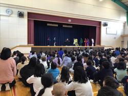 今日の朝は、体育館で給食集会があり、全校が参加しました。給食委員が食まるファイブになりきって、主食や主菜、副菜などバランスのよい食事をする大切さを、劇にして全校に知らせることができました。給食委員は2学期から練習して熱演したので、見ている子どもたちは声を出しながら楽しんでいました。みんなが、自分の苦手な野菜や食べ物を少しでも食べて、バランスのよい食生活をしてほしいと思います。