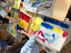 今日は2年生のクラスで、図画工作の時間に版画づくりに取り組みました。ローラーやスポンジを使い、インクの広がりを感じながら一生懸命に制作している姿が印象的でした。自分の思い描いた模様や形が少しずつ紙に表れていくと、子どもたちからは「できた!」と嬉しそうな声も聞こえてきました。
