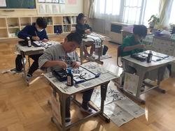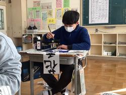 3学期に行う校内書き初め大会に向けて、5年生は「強い決意」、6年生は「花香る街」を練習しました。