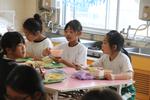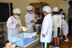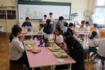 本校は家庭科室で全校児童と職員が集まり、みんなで食事をします。