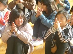 月曜朝会で教頭先生がみんなが楽しめる催しを企画してくださいました。教頭先生がみんなに「今からみんなの指に魔法をかけます。薬指だけ離れなくなります。」と言い、教頭先生の言うとおりに指を合わせていくと他の指は離れるのに、なぜか薬指だけ離れなくなりました。子供たちは大騒ぎです。それからもいくつか指を使ったマジックを行い、楽しい月曜朝会になりました。月曜の朝が楽しくなるような催しをこれからも考えていきたいと思います。