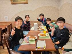 朝、6時30分にジャンボタクシーで学校を出発した子供たちは、新幹線、近鉄特急を乗り継ぎ、11時頃無事、近鉄奈良駅に到着しました。その後、奈良公園に向かい、若草山山麓にある古都屋さんでカツカレーを食べ、パワーをチャージして午後からの活動に備えています。全員、元気です。