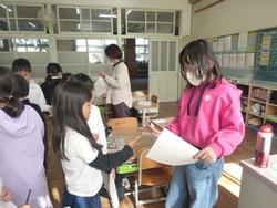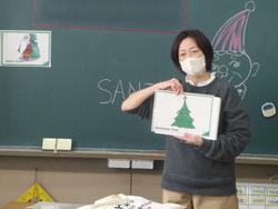 1年生から3年生が、外国語の授業で、クリスマスに関係のあるゲームをして楽しみました。初めに「Christmas tree」、「cake」、「present」、「bell」などクリスマスに関係のある英単語を何度も繰り返し発音し覚えました。次に、覚えた英単語を使ってゲームをしました。3×3のマス目9つにクリスマスに関係のある英単語が9つ書かれています。友達同士じゃんけんをし、負けた子が「What do you want?」と聞きます。勝った子は、「Cake please.」というように英単語を言い、その英単語を丸で囲んでもらいます。時間内にできるだけ多くビンゴを作った子が勝ちというルールです。子供たちは、できるだけ多くのビンゴを作るために多くの友達に「Hello!」と声をかけ、英語で関わることができていました。このようにゲームをしながら「What do you want?」「○○please」の言い方を完全にマスターしていました。1年生から3年生が合同で授業をし、楽しく2学期の最後の英語の授業を終えることができました。