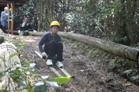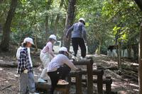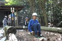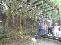 落ち葉スキーの後は、フィールドアスレチックです。森の中に設置されたアスレチックに、子どもたちの歓声が響き渡りました。途中、クモの巣が邪魔をしていたり、木が欠けていたりしているところもありましたが、それはそれ、臨機応変に楽しむ子どもたちの姿にたくましさを感じました。活動中にお茶がなくなってしまった子もいたようで、予想以上の暑さに、体調に気を配りながらのアスレチックになりました。