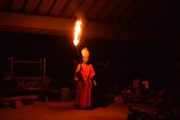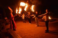 いつの間にか空が暗くなり、キャンプファイヤーの時間がやってきました。エールマスターの♪クンバイヤ♪が山々に響きます。何とも言えない神秘的な空気の中、5年生の♪遠き山に日は落ちて♪が始まり、ハミングへと変わったタイミングで、「山の神」が登場します。「校長先生ですよね」と叫ぶ声を聞き流し、中央の井桁に火をうつします。井桁は一気に燃え上がり、太陽の広場が明るく照らし出されました。今から始まる楽しみな時間にワクワクしている5年生の顔が並びます。エールマスターの「さあここからはみんなで楽しみましょう」の合図で、スタンツが始まりました。各チームごとに、工夫を凝らしたスタンツがファイヤーを盛り上げます。「火の神」の個人的な見解では、昔ばなし「桃太郎」の劇が、お気に入りでした。ボンファイヤーの最後には、担任と教務主任の先生によるトワリングがサプライズで披露され、子どもたちから感嘆の声が上がっていました。