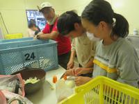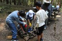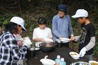 落ち葉スキーとフィールドアスレチックを思う存分楽しんだ5年生の、次なるミッションは飯ごう炊飯。自分たちの夕食のために、ご飯とカレーを作らなければなりません。炊飯オリエンテーションを受けた後、5つのグループに分かれて活動開始です。4班に加えてもらった私は、いろいろ役に立とうと、テントサイトに行きますが、すでに役割分担の下、炊飯活動が進んでおり、出る幕なしでした。きれいに組まれた炉のもとで、火もすぐにつきました。飯ごうをかけ、ご飯を炊き、カレーなべを準備し、カレーを煮込みます。火の準備をする役も大切ですが、やはり、お米を洗ったり、野菜の下ごしらえをしたりと、流し場で奮闘してくれた女子2人の活躍は素晴らしかったと思います。片付けでも、この2人が粘り強く丁寧に洗い物をしてくれました。他の班にも、「面倒だなあ」と思う仕事に前向きに取り組める子がたくさんいたと思います。さすが5年生です。