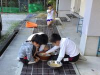 今日は、脱穀、籾摺りを昔ながらの手作業で行いました。まずは、十分に乾かした稲穂から籾をとりボウルに集めます。その後、すり鉢に籾を入れて、ボールで籾摺りをしました。コンバインではあっという間の作業も、手作業では思った以上に時間がかかり、苦労していました。今ではなかなかできない作業だけに、よい体験ができました。