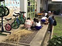 先日の稲刈りの際に、ほとんどの稲はコンバインで脱穀しましたが、5年生が一部をそのまま持ち帰りました。稲刈り後の作業も、自分たちの手でやってみたいという思いからです。