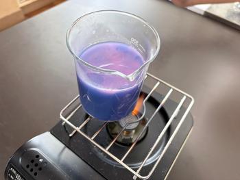 ビーカーに入れた水を温め、どのように熱が広がっていくのかを観察しました。示温インクを使って水の動きを目で見えるようにすると、「あ、下から上に動いてる!」「ぐるぐるまわってるよ!」と、子どもたちは水の流れの変化に興味津々。温かい水は上に、冷たい水は下に動くことを実験からつかむことができました。