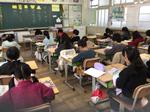 文字の外形について学習をしました。水書用紙・水書ペンを使って大きく文字を書き、文字の細部への気付きを深めました。写真は「百」と「四」を書いているところです。最後は、速くきれいに書くことを意識して視写をしました。約10分間、集中して真剣に書くことができ、書写技能が向上していることを感じて嬉しかったです。