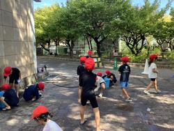 マヨネーズの容器やペットボトルを使って、水をお互いにかけあい、楽しく活動することができました。