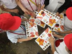 今、生活科の学習で、1年生が「あきみつけ」をしています。秋の葉っぱや木の実のカードを見ながら、「同じ葉っぱがあった!」「まわりがぎざぎざだから、これは桜だ」など、真剣に探していました。これから、どんぐりなどの木の実を集めて、工作をする予定です。(酒井・前村)