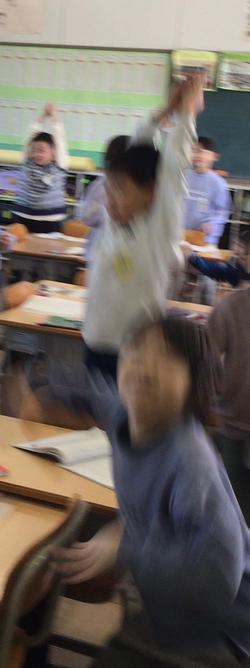 1年生の国語の授業では「みみずのたいそう」という詩について学習しました。「みみずのたいそう ぴんぴこぴん」と、体を使ってみみずの様子を表現することができました。
