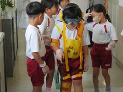 後半は、白内障が体験できるゴーグル、肘・膝・腰の自由を奪うプロテクター、足首に重りなどを身に付け、高齢者疑似体験を交代で行いました。普段よりも不自由な動きしかできないことを体験し、周りで支えようとする姿が随所で見られました。
