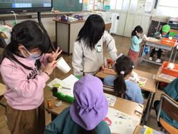 今日、山中保育園の年長さんと1年生との交流会がありました。初めに、1年生の授業を見てもらい、その後、松ぼっくりけん玉を作って遊んだり、学校探検をしたりしました。そして、クラスごとにロンドン橋やじゃんけん列車で遊んだりして、一緒に楽しみました。4月に、安心して小学校に通う手助けができたらいいなと思って活動しました。年長さんの笑顔や1年生の子たちの満足そうな顔を見て、温かい気持ちになりました。