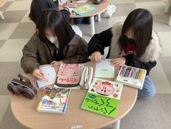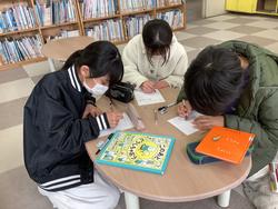 6年生がペア学級の1年生に向けて、おすすめの本をはがきで伝える読書郵便を書きました。それぞれのペアの子のことを考え、自分たちのおすすめしたい本を熟考して選び、丁寧にはがきを書いて送りました。