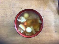 ◆走り終わったあとの「矢南汁」。伝統の味を味わう矢南っ子の表情がにっこりでした。「おいしい!」「うまい!」「もっと食べたーい」の大合唱でした。