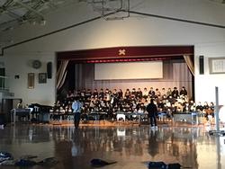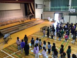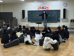 職員室前のろうかを2列で静かに歩いて体育館に向かう2年生。教室を出発したところから、もう練習は始まっているのですね。入場後の待つ姿もすてき!そして、挨拶をして、清水先生が発する言葉をみんなで復唱!劇の中の言葉もみんなで唱えて、セリフを言うすてきな声の土台ができました。歌練習で、歌声もどんどん透明感のある歌声にかわっていきました。