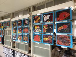 図工で取り組んだ版画が掲示されています。作品完成までに、各学年さまざまな活動があってたどり着いています。よーく見ると細かく彫ってあったり、いろんな材料を重ねていたり、工夫がいっぱい!見ていると楽しくなりますよ。