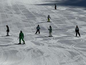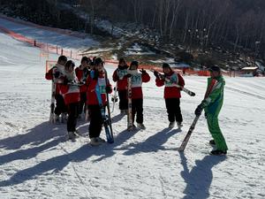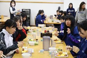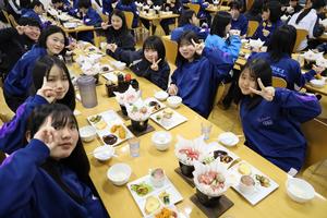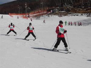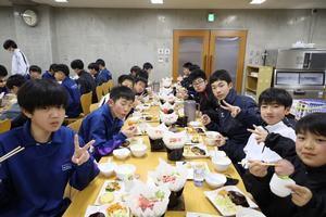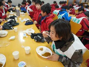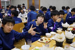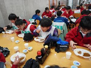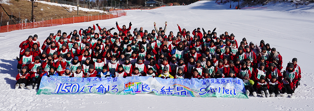 スキー学習2日目です。みんな朝からもりもり食べてます。朝食の後は、学年全体で写真を撮ってから実習②が始まります。
