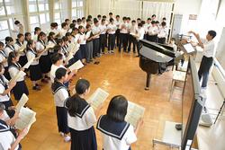 今日は、2回目の、全校合唱の練習が行われました。各教室に分かれて行ったパート練習の後、全校生徒が音楽室に集まり、初めて、全校で声を重ねました。山根先生の力強いピアノの音に負けないくらいしっかり声が出ていました。これからの仕上がりが楽しみです。