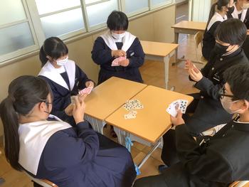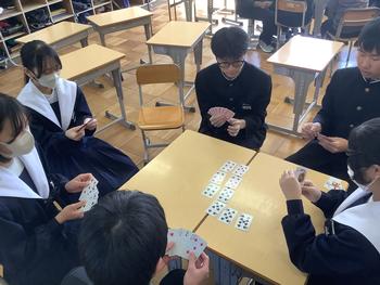 お昼休みに2学年合同レクが行われました。卒業が近い3年生とお話をしながら楽しくトランプを行いました。3年生が決めた7つのグループに分かれて「ババ抜き」や「7ならべ」等を行いました。どのグループも会話が弾み、笑顔が見られました。明日は1年生と3年生の合同レクです。3年生と楽しい時間が過ごせるとよいと思います。