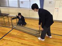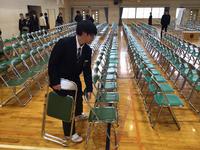 卒業式に向けて、2年生の生徒が会場準備をしました。椅子や机を並べ、壊れているものがないか点検したり、列が整っているか確認したりするなど、卒業生のために心を込めて準備をする姿に感心しました。