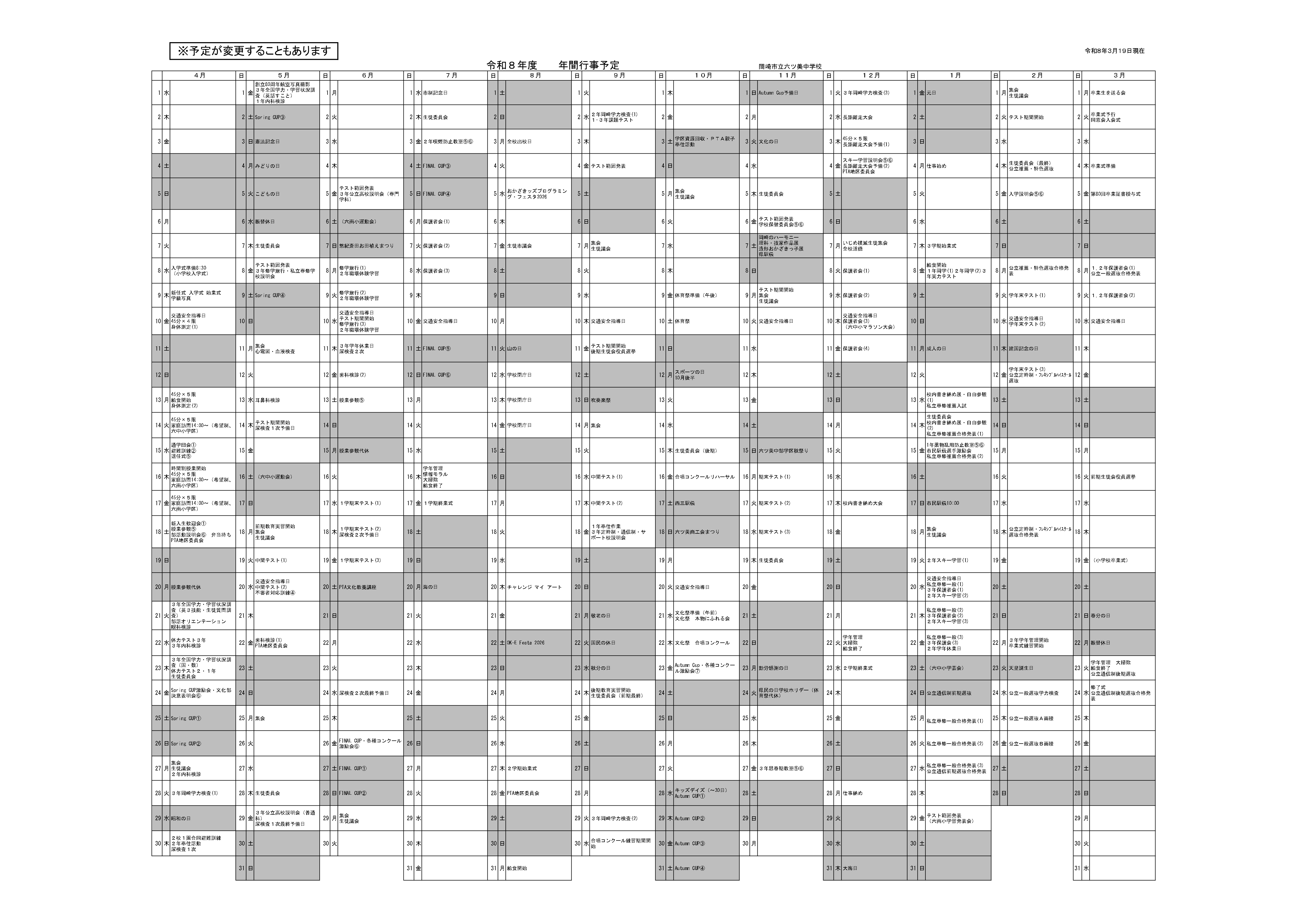 令和8年3月18日現在の予定です。健診関係等、今後変更の場合もあります。