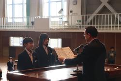 今日の朝の集会で、社会科研究作品や理科作品展、技術・家庭科作品展の