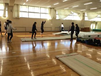 空気が一段と冷たい一日でした。体育科では、2・3年生が運動場で長距離走に、1年生が武道場でマット運動に取り組んでいます。前転や後転といった基本的な技から、ロンダートや前方倒立回転跳びといった発展的な技まで、生徒自身が取り組みたい技に挑戦しています。友達の様子を見ながら、つま先や手の付く位置、目線などを工夫することで、美しく見えるように取り組む姿が見られました。