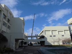 体育館エアコン設置工事ではクレーン車が校内に入り、足場の材料を運び上げていました。