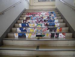 卒業式の少し前に、芸術部の皆さんが階段アートを貼り替えてくれました。中には「入学」の文字も見えます。